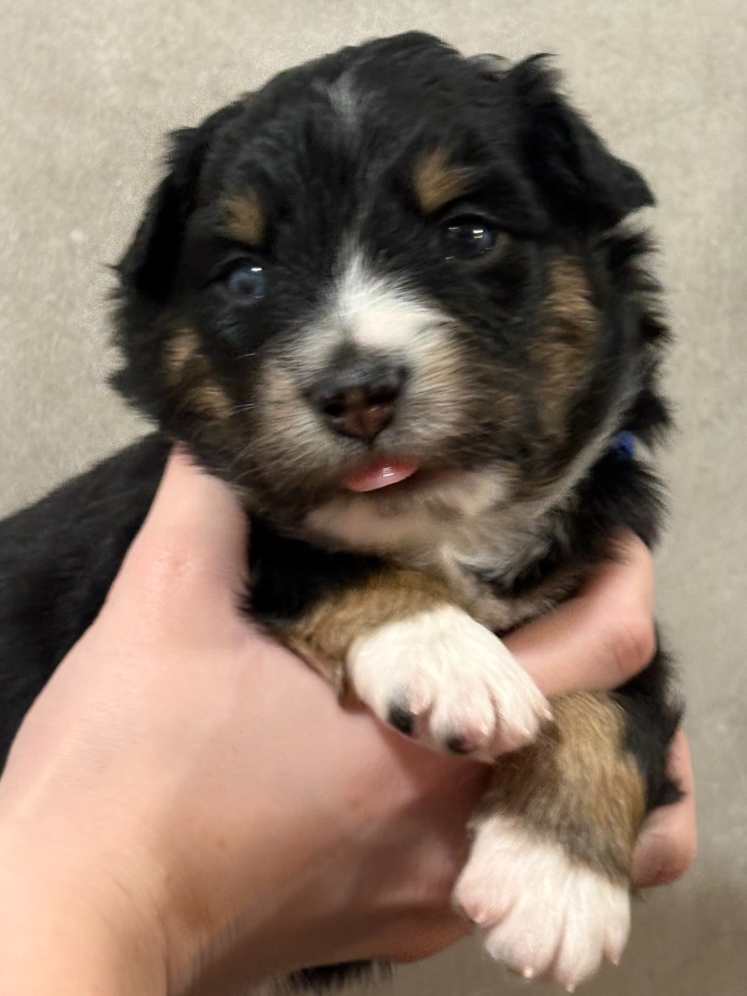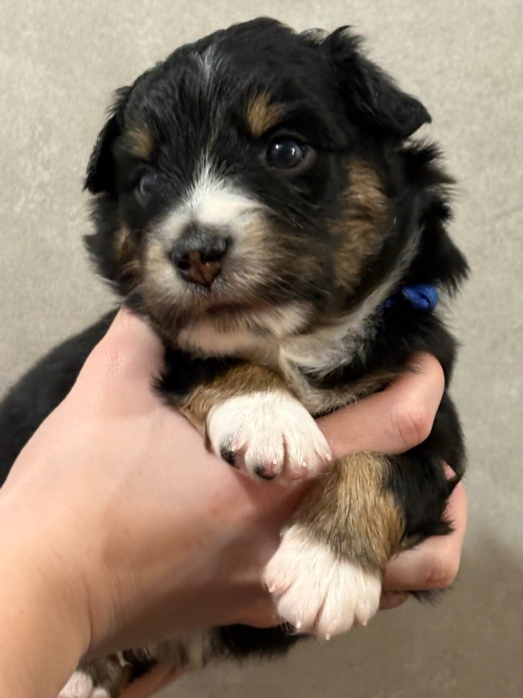 Noir tricolore,collier bleu Yeux vairons,queue longue